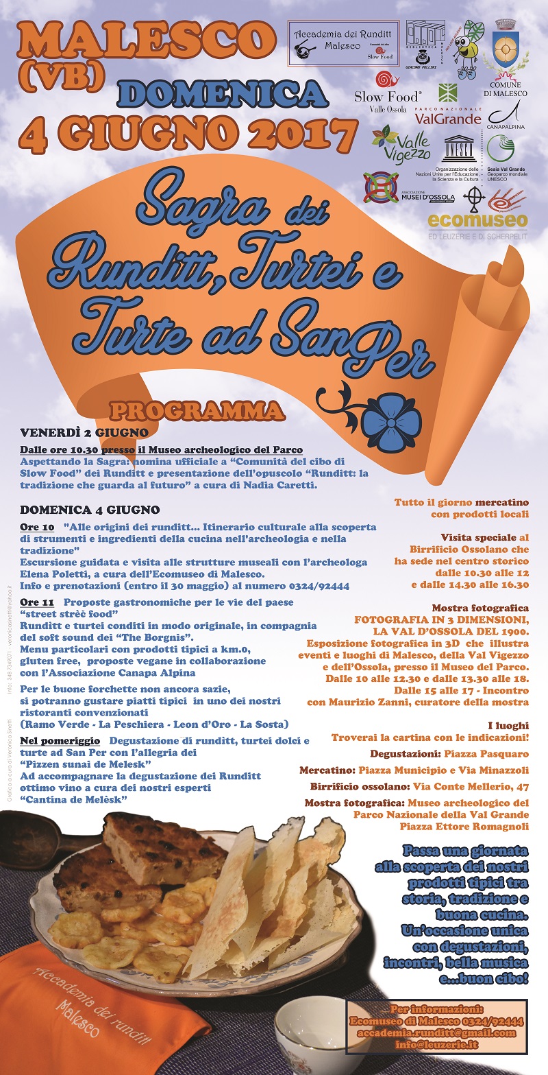 La Sagra “Runditt, turtei e turte ad San Per” si svolgerà il 4 giugno, nelle piazze del centro storico di Malesco. Oltre alle degustazioni di prodotti locali, durante la giornata, sono previste una serie di attività.