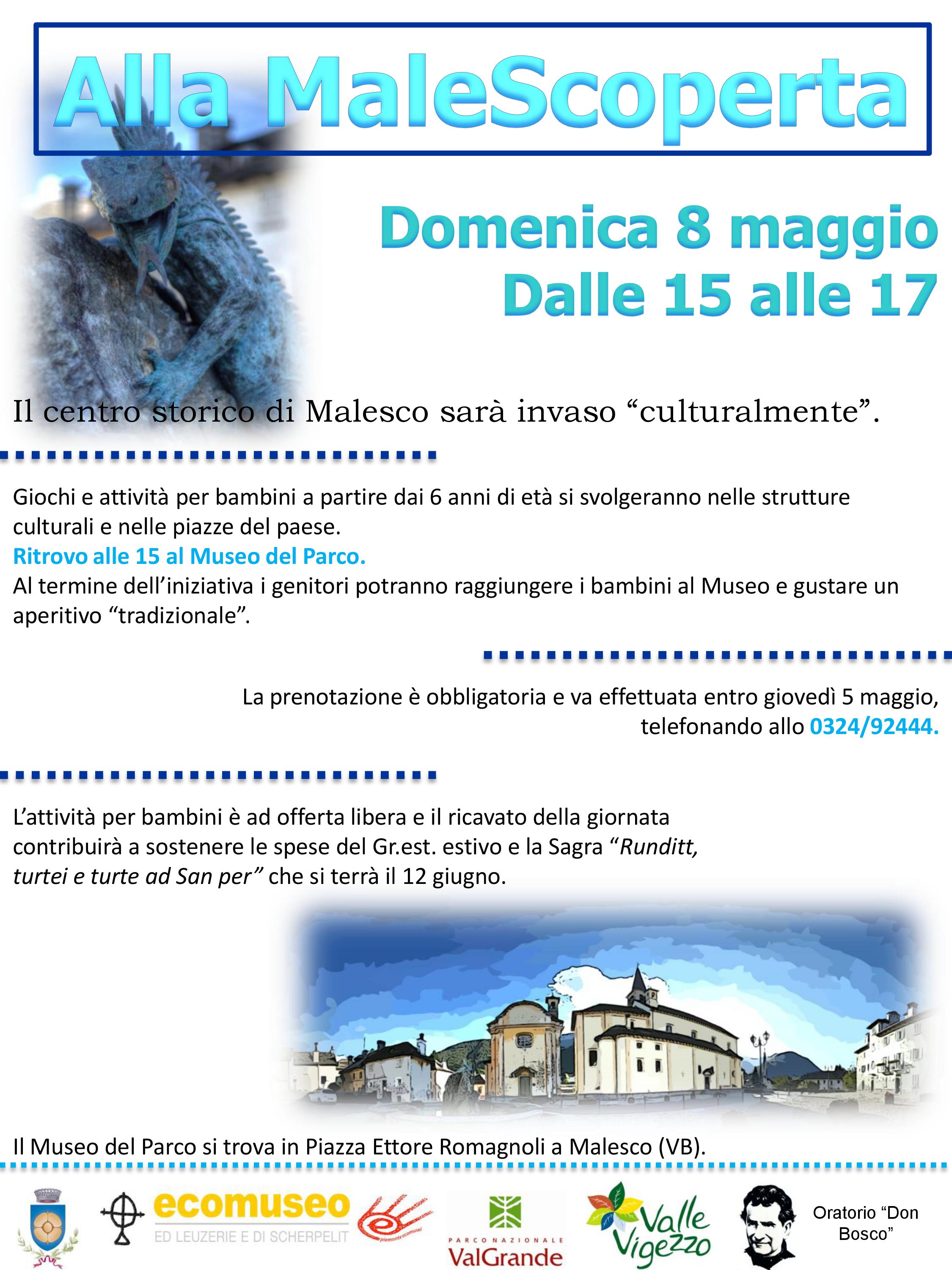 Domenica 8 maggio, dalle 15 alle 17, si svolgerà un’iniziativa dal titolo Alla MaleScoperta, nel centro storico di Malesco, L’evento organizzato dall’Oratorio Don Bosco e dall’Ecomuseo della pietra ollare e degli Scalpellini, prevede una serie di attività per bambini (dai 6 anni in su) che si svolgeranno nelle piazze storiche, al Museo archeologico del Parco Nazionale della Val Grande e al lavatoio. Lo scopo è quello di far conoscere il patrimonio immateriale e non del territorio; i partecipanti, organizzati a squadre, si dovranno cimentare in giochi inerenti la storia e la tradizione.
