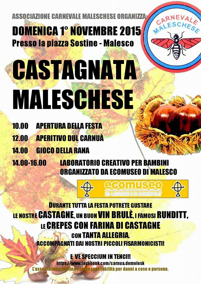 Domenica 1° novembre, dalle ore 10, l'Ass. Carnevale Maleschese propone la Castagnata Maleschese. Alle 12 l'aperitivo dul Carnuà e nel pomeriggio dalle ore 14 vi aspettano il gioco della Rana e un laboratorio creativo per bambini, organizzato in collaborazione con l'Ecomuseo ed Leuzerie e di Scherpelit di Malesco.