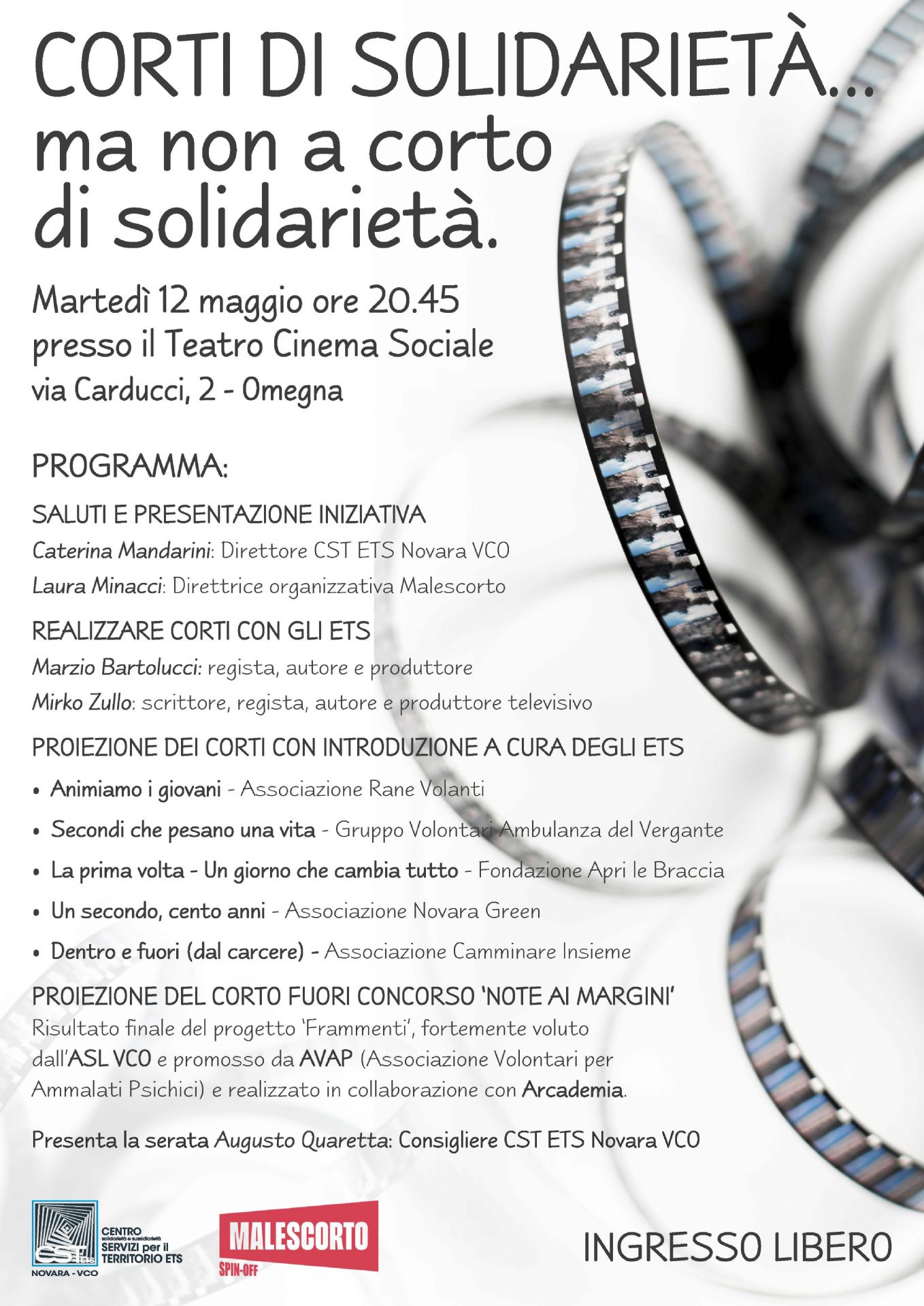 La serata di presentazione ufficiale si terrà martedì 12 maggio alle ore 20.45, presso il Cinema Sociale di Omegna, con ingresso libero. A condurre l’evento sarà Augusto Quaretta, consigliere CST, che introdurrà il progetto a cui seguiranno i saluti istituzionali.