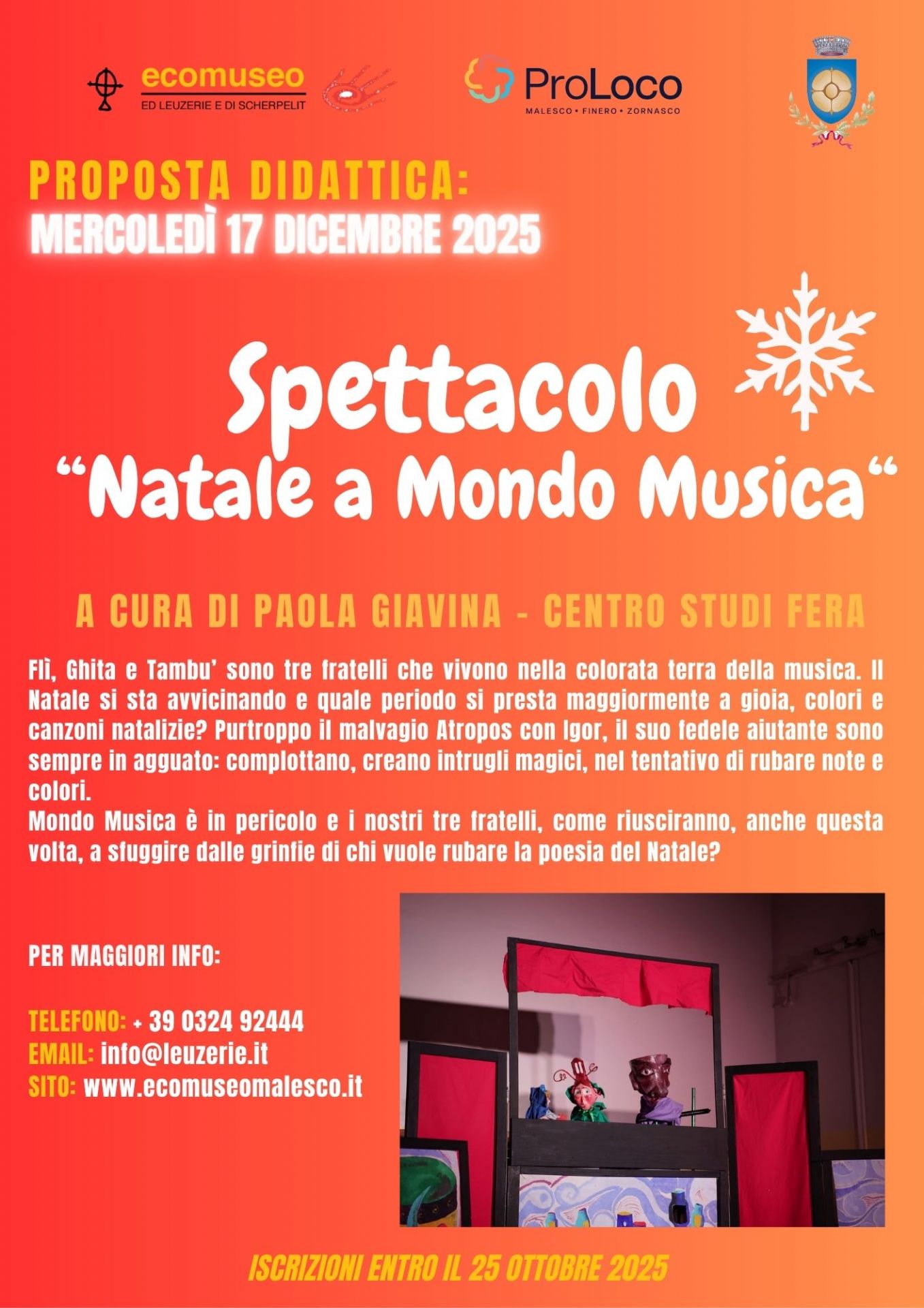 In occasione delle festività natalizie, le scuole dell’infanzia e primarie sono invitate a partecipare a una speciale esperienza teatrale pensata per accendere la meraviglia dei bambini e trasportarli in un mondo fatto di colori, armonia e fantasia. Lo spettacolo “Natale a Mondo Musica”, in scena presso il Cinema–Teatro comunale di Malesco, rappresenta un’occasione unica per vivere il Natale attraverso il linguaggio universale della musica e del racconto teatrale.