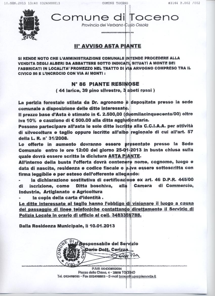 COMUNE DI TOCENO: AVVISO ASTA TAGLIO BOSCO