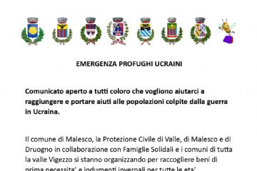 Il Comune di Malesco, insieme a Famiglie Solidali e tutti i comuni della Valle Vigezzo, organizza una RACCOLTA BENI in favore dei Profughi Ucraini vista la delicata situazione attuale. Tutte le...