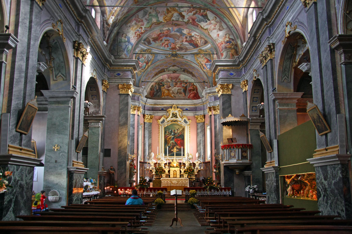 Dedicata ai SS apostoli Pietro e Paolo, la chiesa parrocchiale aveva, in origine, dimensioni più ridotte e solo nel 1700 fu ampliata verso levante in modo significativo. Il pavimento è del 1839 e mostra la tipica scacchiera bianco nera, composta con marmo bianco di Scaredi e serpentino di Patqueso. Sotto le festività natalizie, all’interno della chiesa, è possibile ammirare uno splendido presepe realizzato a mano dagli abitanti del paese.