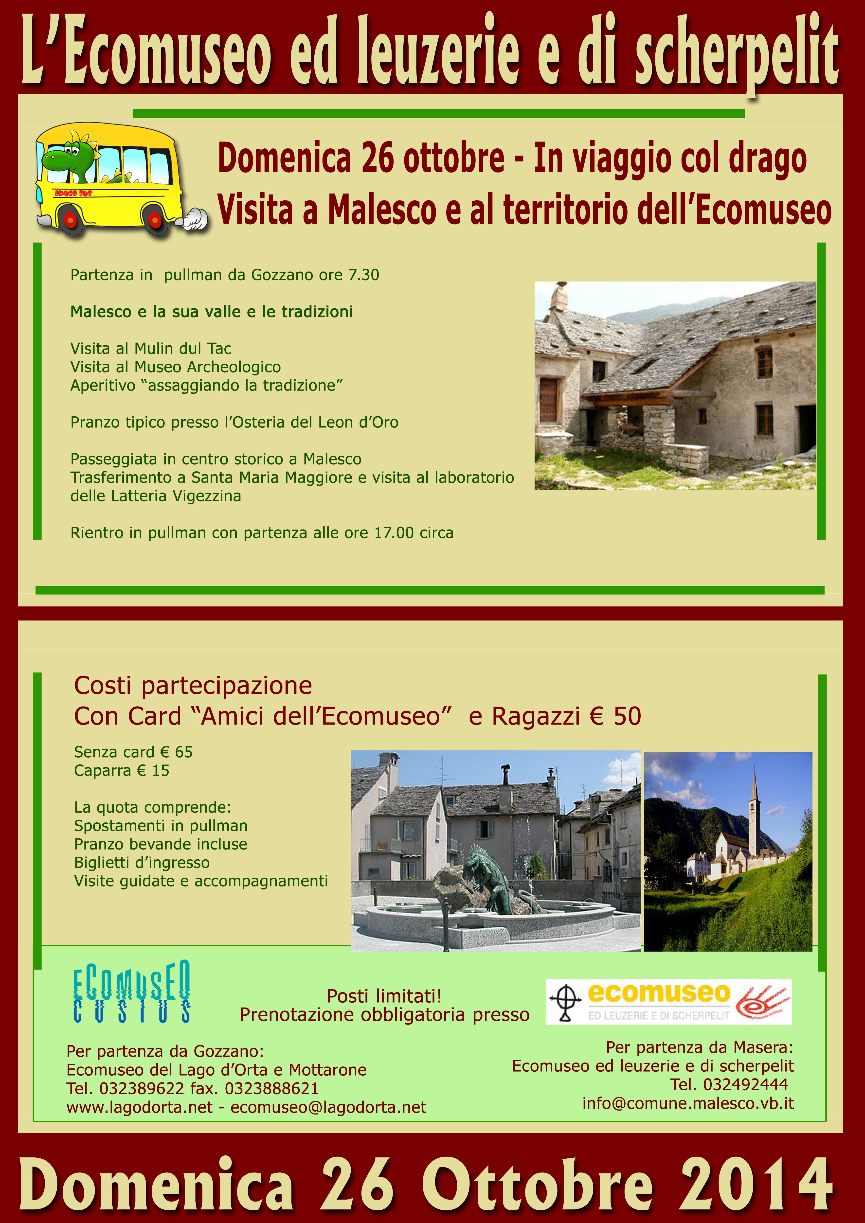L'Ecomuseo del Cusius organizza una gita all'Ecomuseo maleschese, proponendo le visite guidate al Mulino e al museo archeologico; a seguire un aperitivo tradizionale, il pranzo con prodotti tipici. si proseguirà il pomeriggio con una passeggiata in centro paese e la visita alla latteria Vigezzina a Santa Maria Maggiore.