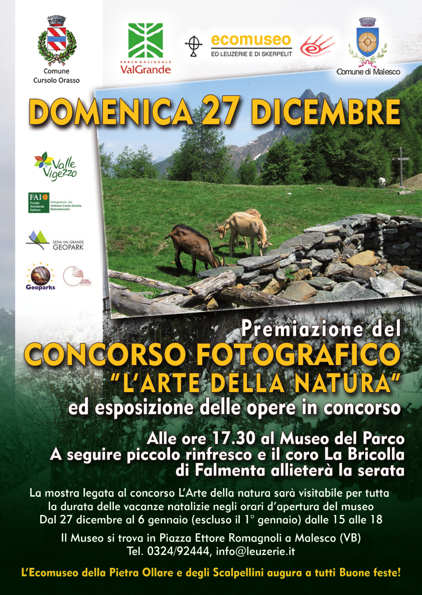 Il concorso fotografico “L’arte della Natura”, il cui tema principale è quello della Bellezza (o arte) della natura e del paesaggio geologico, è stato organizzato dal Comune di Cursolo Orasso, il Parco Nazionale Val Grande, il Comune e L’Ecomuseo di Malesco.