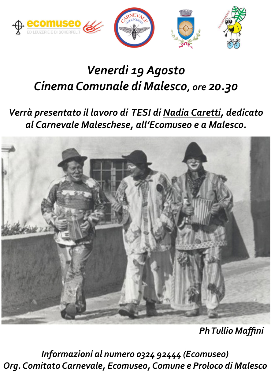 Venerdì 19 Agosto, in collaborazione con il Comitato Carnevale, l'Ecomuseo e il Comune e la ProLoco di Malesco, presso il cinema comunale di Malesco alle 20.30, verrà presentato il lavoro di Tesi di Nadia Caretti su Malesco, il suo storico Carnevale e l'Ecomuseo.